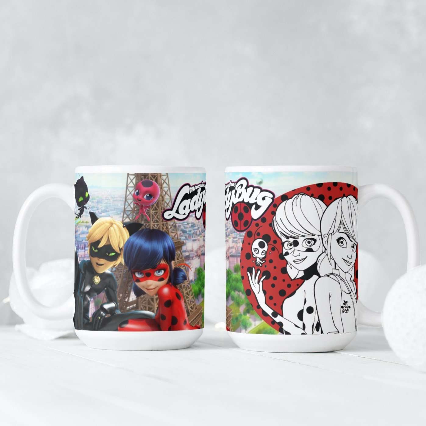 Miraculous Ladybug mug featuring colourful and black-and-white designs of Ladybug and Cat Noir